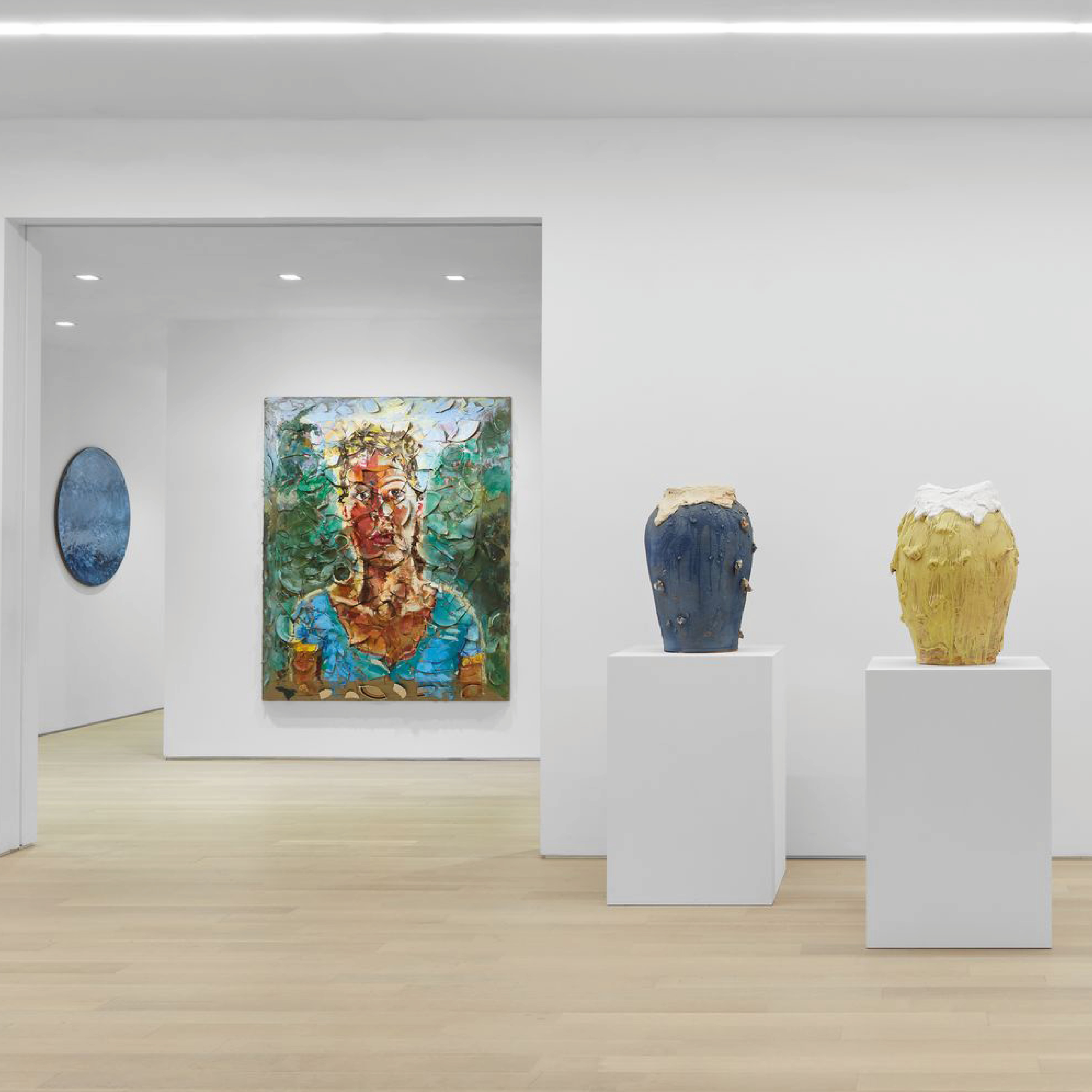 By Fire, Ceramic Works | ALMINE RECH GALLERY / Installation view of the current exhibition By Fire, Ceramic Works, From left to right: Jean-Baptiste Bernadet, Julian Schnabel, Miquel Barcelo, and Jean-Baptiste Bernadet. Photo credit: Matthew Kroening.Courtesy of Artists and Almine Rech. | 2018